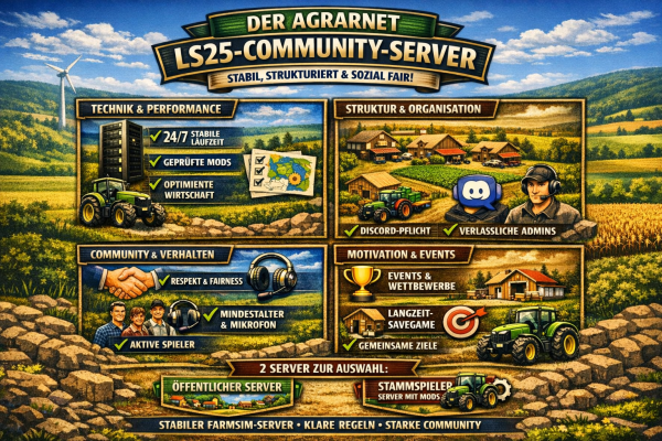 AgrarNet ist ein LS25‑Multiplayer‑Server mit Fokus auf Teamarbeit, gemeinsamen Feldern und strukturierten Aufgaben. Ideal für Spieler, die zusammen etwas Großes aufbauen wollen.